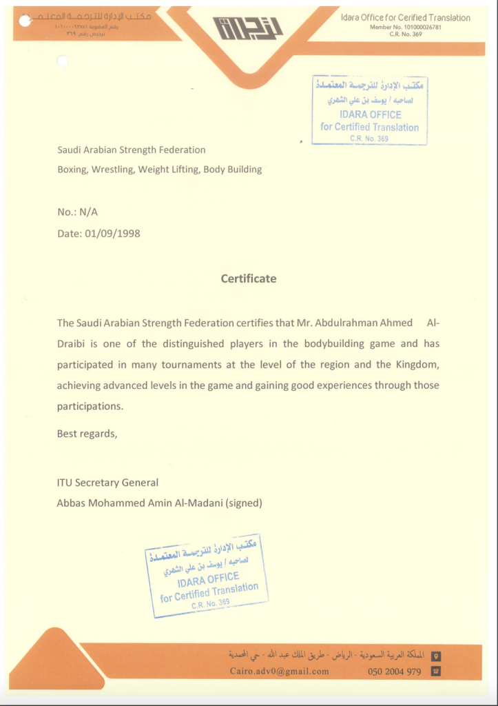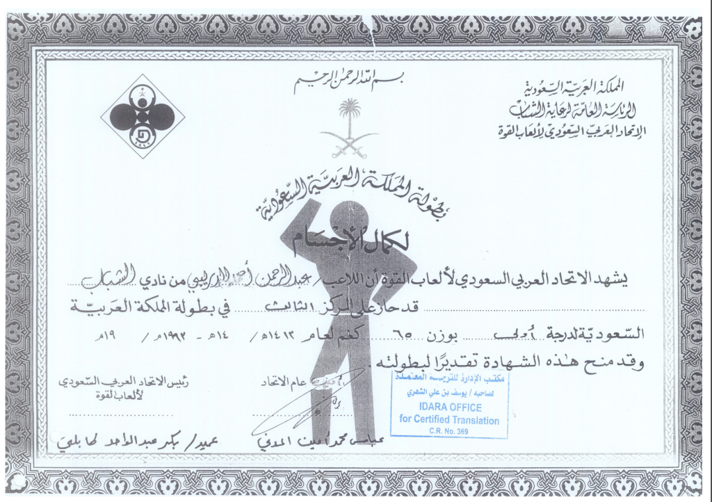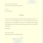 - شهادة الأتحاد العربي السعودي لرفع الأثقال وبناء الأجسام